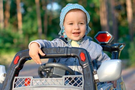 Portrait of a smiling baby at the toy car