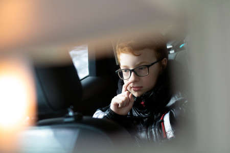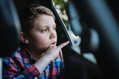 Sad bored caucasian boy traveling by car sitting by open window.