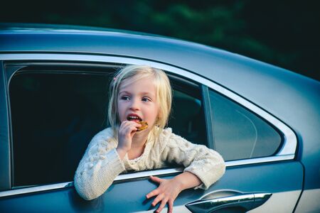 Dreaming child girl look out from the car window. Portrait of little child girl sitting in car. Cute little child girl smiling and having fun to travel by car.