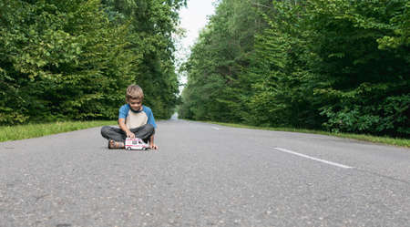 A little boy plays with a toy ambulance on the road