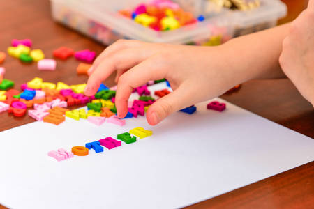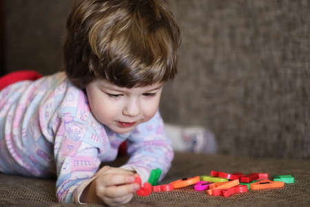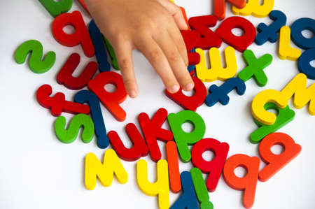 A small child plays with colored letters and tries to put them into words. Preschool education concept.