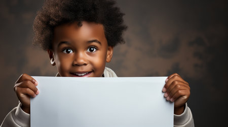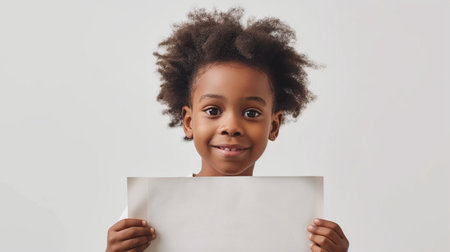 african american little girl holding blank paper and looking at camera