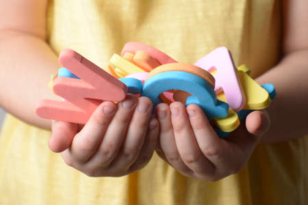 Collection of spongy alphabet letters in little girl hand with yellow dress at background