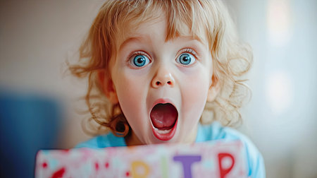 A young child expresses pure joy and excitement while holding a colorful gift box, showcasing wide blue eyes and a surprised mouth, capturing a moment of pure delight.