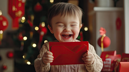 A cheerful toddler opening a red envelope, with festive Chinese New Year decorations in the background.