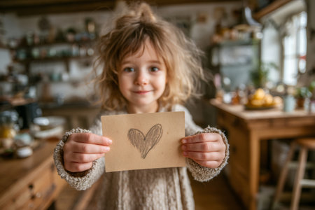 Smiling child holding a self-made greeting card with a heart in a rustic kitchen, expressing love and care