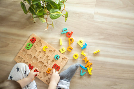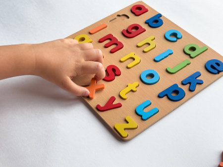 Childs hand arranging colorful alphabet puzzle on wooden board