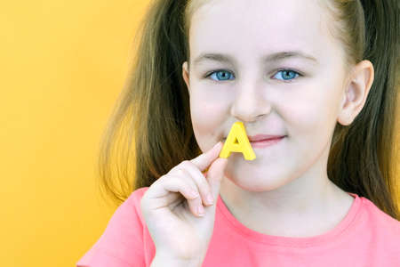 speech therapy. Toddler girl holding the letter A in her hands. Classes with a speech therapist. girl on isolated yellow background
