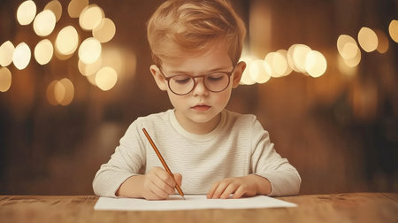 Young boy in glasses writing on paper with warm glowing lights in background. Learning and education