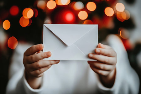 Festive greeting: hands holding a white envelope amidst warm holiday lights.