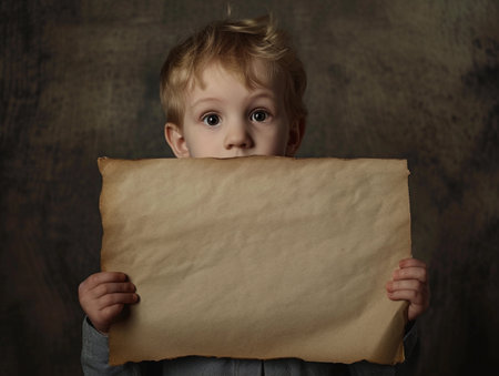 Little boy peeking over a large brown paper sign, with a curious expression and dark background.