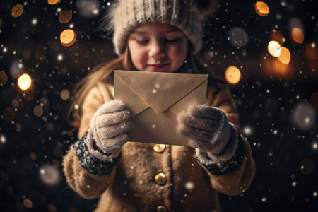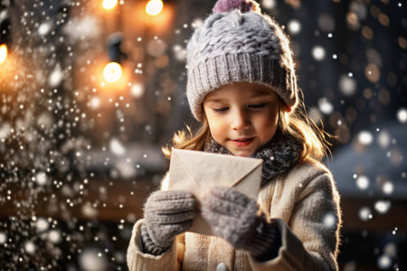 A little girl in winter clothes holding an envelope outside in snowy weather against the background of lights. A letter for Santa Claus. The winter atmosphere of a festive invitation.