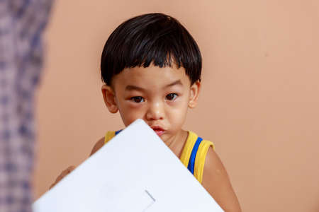 A Full Face of Adorable toddler Asian baby boy (2-year-old) Enjoys Playing and Holding a Paper Box by Self with Blurry Background. Children's closeup portrait of activity and lifestyle concept.