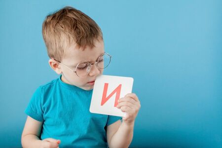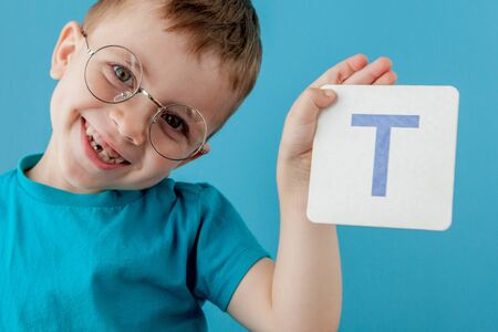 Cute little boy with letter on blue background. Child learning a letters. Alphabet.