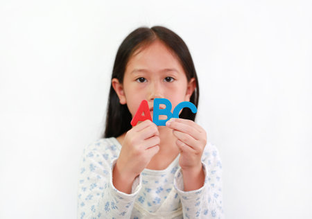 Asian little girl child holding ABC sponge text in hands over white background. Education and development concept. Focus at letters in hand