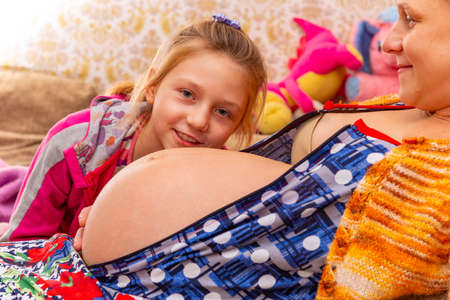 Pregnant young mother sitting on the bed with her little cute daughter while listening the baby in belly mom at home. Motherhood expectation with love in family.
