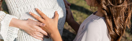 partial view of girl embracing belly of pregnant mom in openwork dress, banner