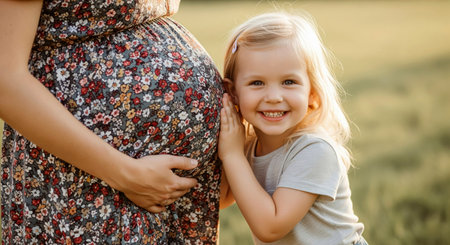 Adorable little girl embracing the belly of a highly pregnant mother, in expectation of a sibling