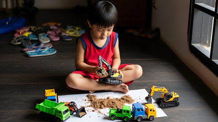 A child in a red sleeveless top sits cross-legged on the floor playing with toy excavators and trucks amidst sand.