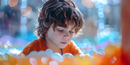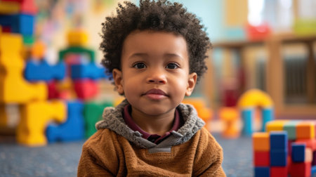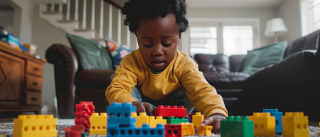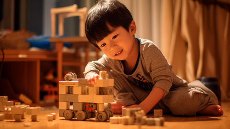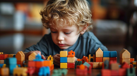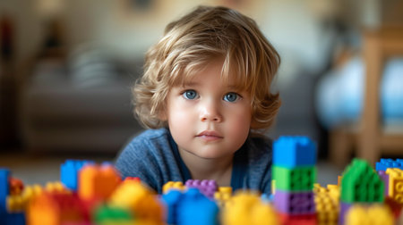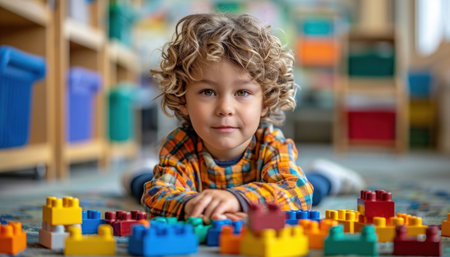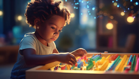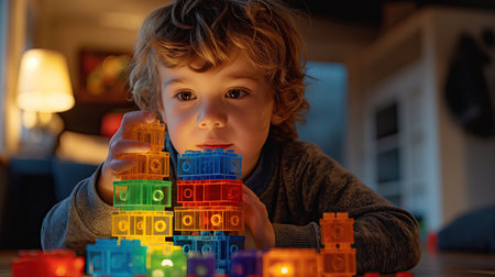A young child plays with colorful blocks under soft lights, showcasing creativity.