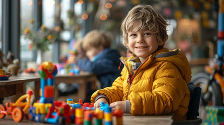 A young boy smiling in a room with toys and other children, AI