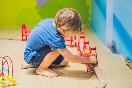 baby game. Little clever caucasian child playing colorful toy railway and train for early development.