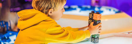 The boy plays with the electronic designer on the light table BANNER, LONG FORMAT