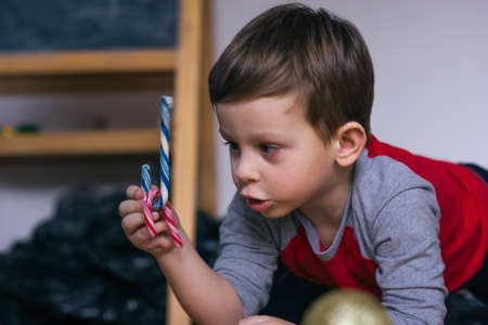 Cute little boy playing with his two favourite candies at Christmas.
