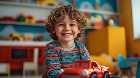 Young boy with curly hair is smiling joyfully while playing with a red toy car in a bright, colorful indoor room.