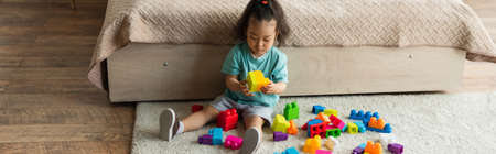 Asian child playing building blocks on carpet, banner