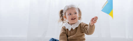 cheerful girl with ponytails holding small ukrainian flag, banner