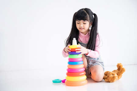 Asian child little girl playing toy ring stack at home or kindergarten