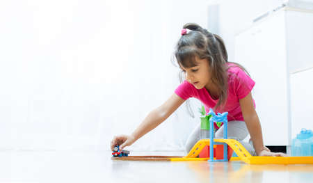 Young little Asian cute kid playing wooden toy on table at home. She is pushing a car running on the wooden rail. Creativity and development toy for kid. Play and learn concept.