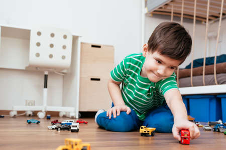A cute little boy is playing on the floor with cars. The concept of children games, entertainment in quarantine, stay home.