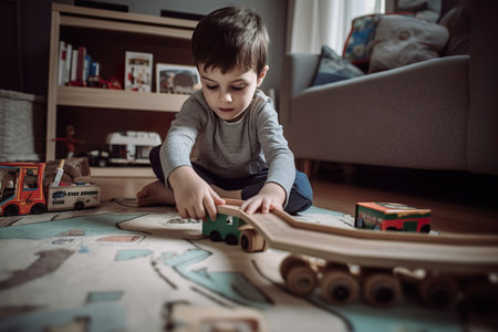 A young boy sitting on the floor with a bunch of toys, AI