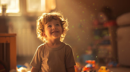 A young boy smiling while sitting on a floor in front of toys, AI