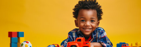 a Playful African American Boy: A boy with a playful expression while holding a toy truck, with scattered toy cars, building blocks, and a ball on a yellow studio background. He is dressed in casual, playful clothing