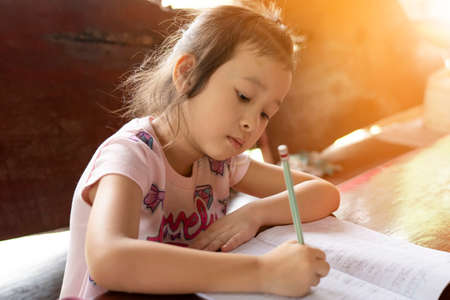 Asian children are studying exercises with determination. She uses a pencil to write on study materials.