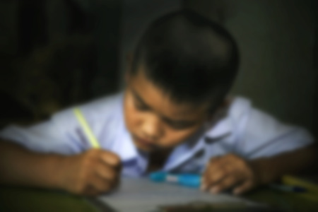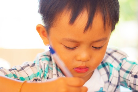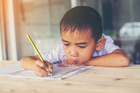 Asian Boy Doing homework with the intention. Child boy holding pencil writing, A boy drawing on white paper at the table,Elementary school and home schooling, Distance Education concept.