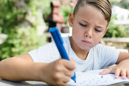 Portrait of cute kid boy at home making homework. Little concentrated child writing with colorful pencil, indoors. Elementary school and education. Kid learning writing letters and numbers.