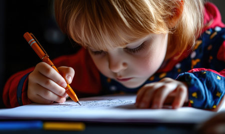 A child focused on drawing with a pen in a cozy, ambient setting illuminated by warm lights.
