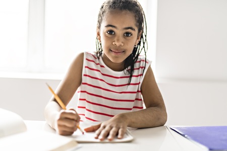 Energetic child focus on writing a diary while sitting at school. Happy elementary student taking a note or drawing a creative picture or coloring a art book in art lesson. Creative activity. AIG42.