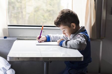 Boy is drawing with a pencil sitting at a table in a street cafe.