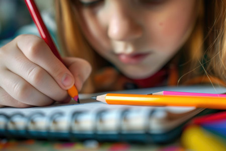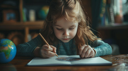 Cute Caucasian girl drawing with pencil, creativity and concentration indoors generated by artificial intelligence