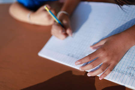Unrecognizable girl doing homework, writing education concept, Coronavirus home school quarantine. A home schooler.