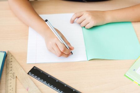 Pupils hand writes with a ballpoint pen in a notebook close-up. A schoolboy performs a task at the workplace. The concept of childrens education, teaching knowledge, skills and abilities.