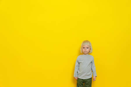 A handsome boy stands on a yellow background. He has long white hair. Studio portrait.