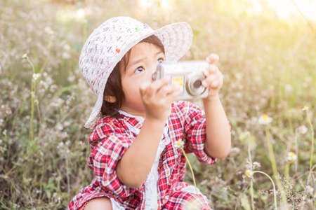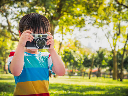 little kids boy taking a picture using a vintage retro film in nature park