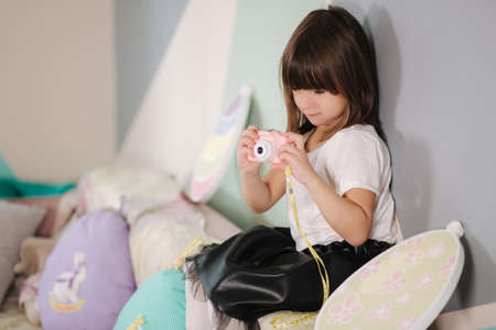 Young girl photographer make photo of her toy camera. Cute little girl play at home