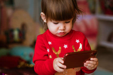 Concept of holidays, kids and technology - happy smiling little girl with smartphone in red christmas sweater sitting on the floor at home next to christmas tree